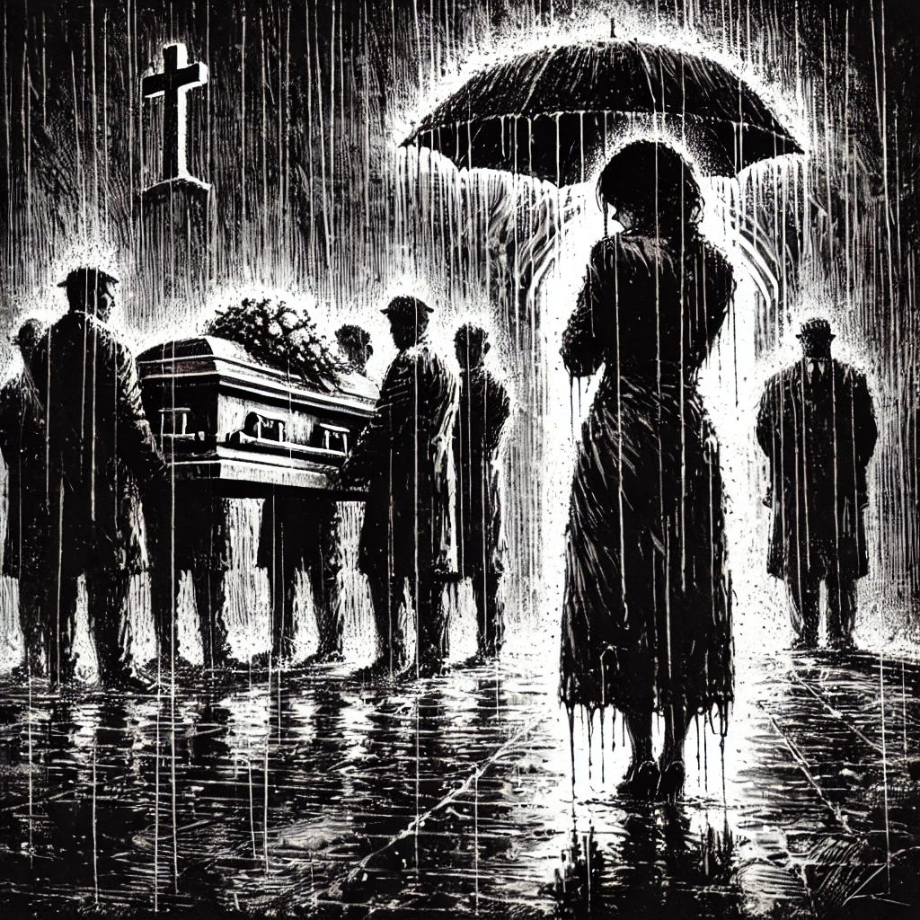 The car stops. There is no procession behind it. Dissolved in the rain. The coffin inside is white. It is simple, without frills or decorations. A man in a dark suit passes in front of me. He runs. He doesn’t want to get wet. With a rapid movement he opens the trunk, from the storm of water three more men appear stretching their arms into the car. The coffin slides out.